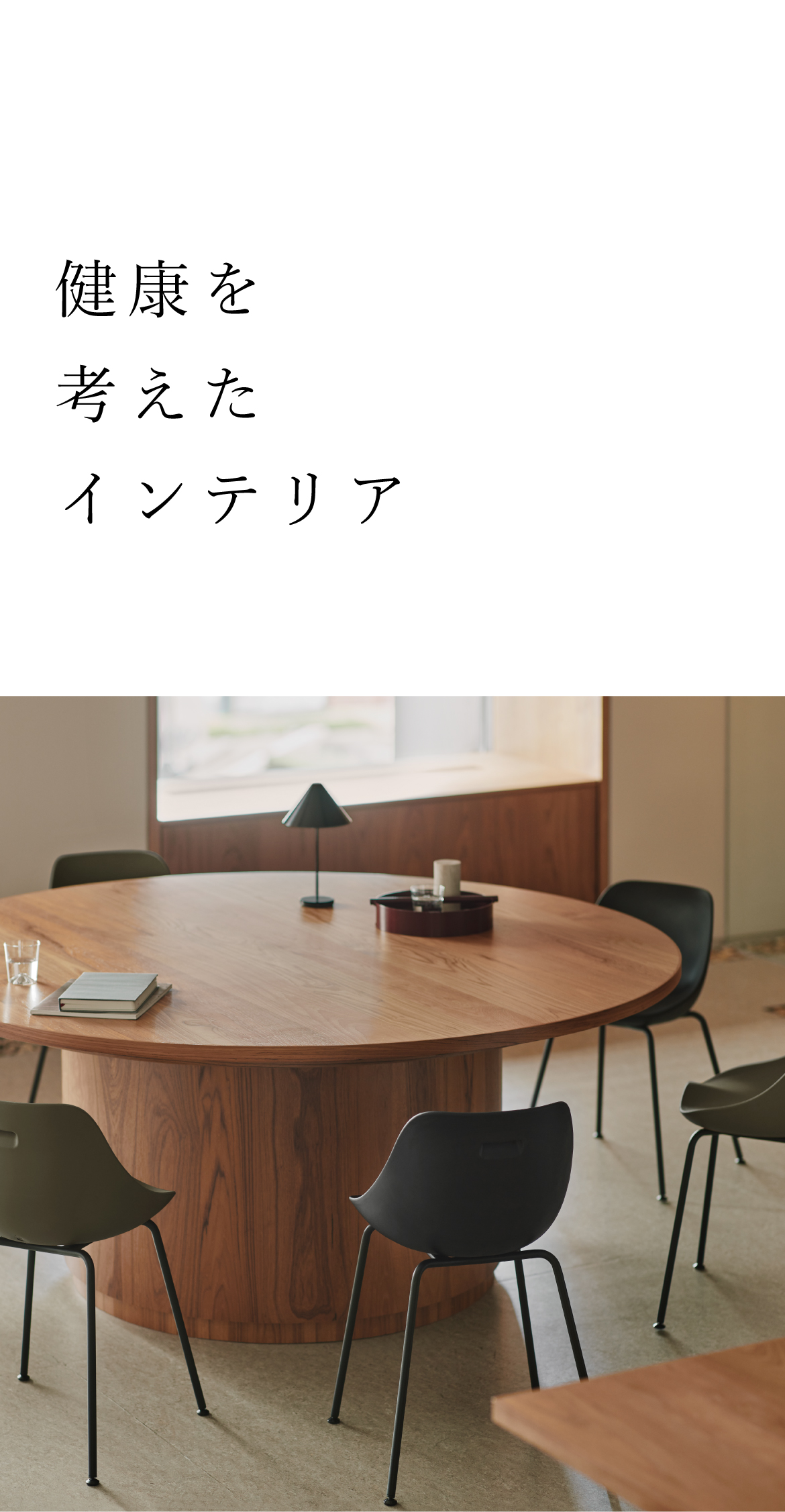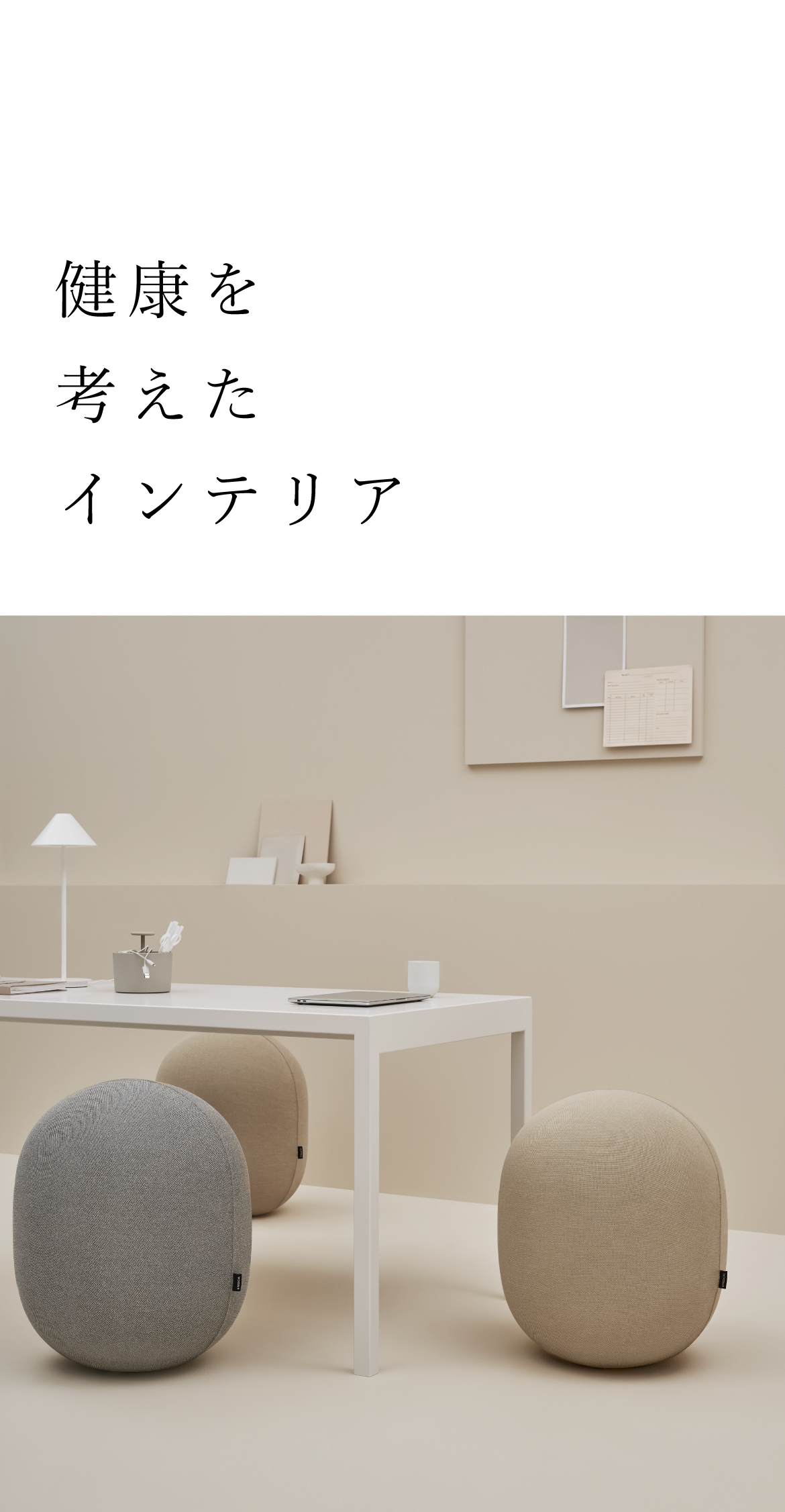 仕事の集中力を高めたり、心身をリカバリーする暮らしのために、健康をサポートするインテリアの可能性を追求しています。からだが喜ぶここちよさをぜひ体感ください。