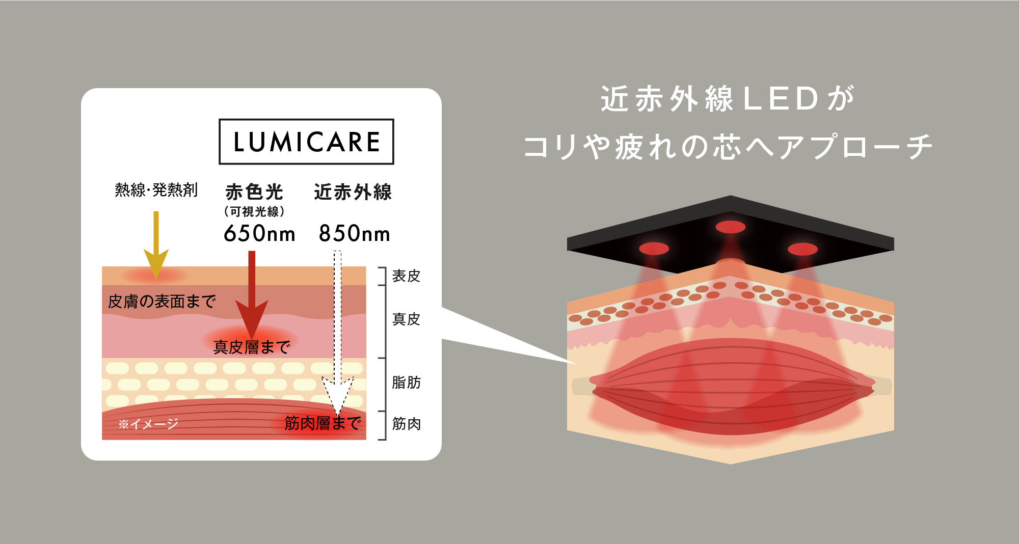 近赤外線LEDには、老化や体調の変化の原因となる「活性酸素種」を体外へ排出しやすくする作用や、血流の促進作用、身体を温める温熱作用もあります。特に温熱作用については、筋肉全体をしっかり温めることにより、血行が改善し、筋肉の張りやこりを和らげる効果が期待できます。