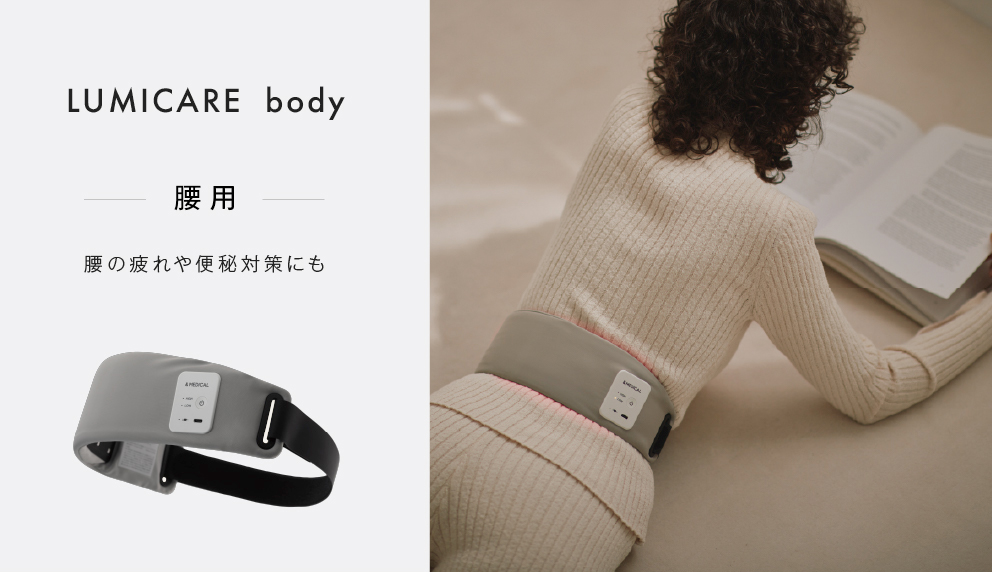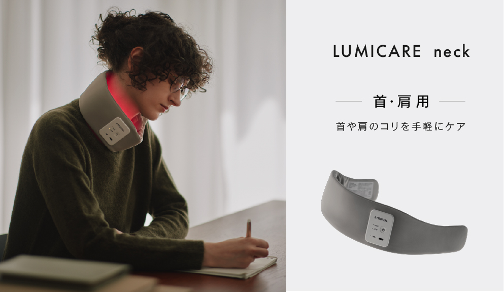 &MEDICALが開発した「LUMICARE(ルミケア)」は、650nm(赤色光)と850nm(近赤外線)の二つの波長のLEDを組み合わせたケアアイテムです。首や腰に巻きつけるだけで、光と温熱の両方を同時に体感でき、気になる部位の疲れに効果的にアプローチできます。