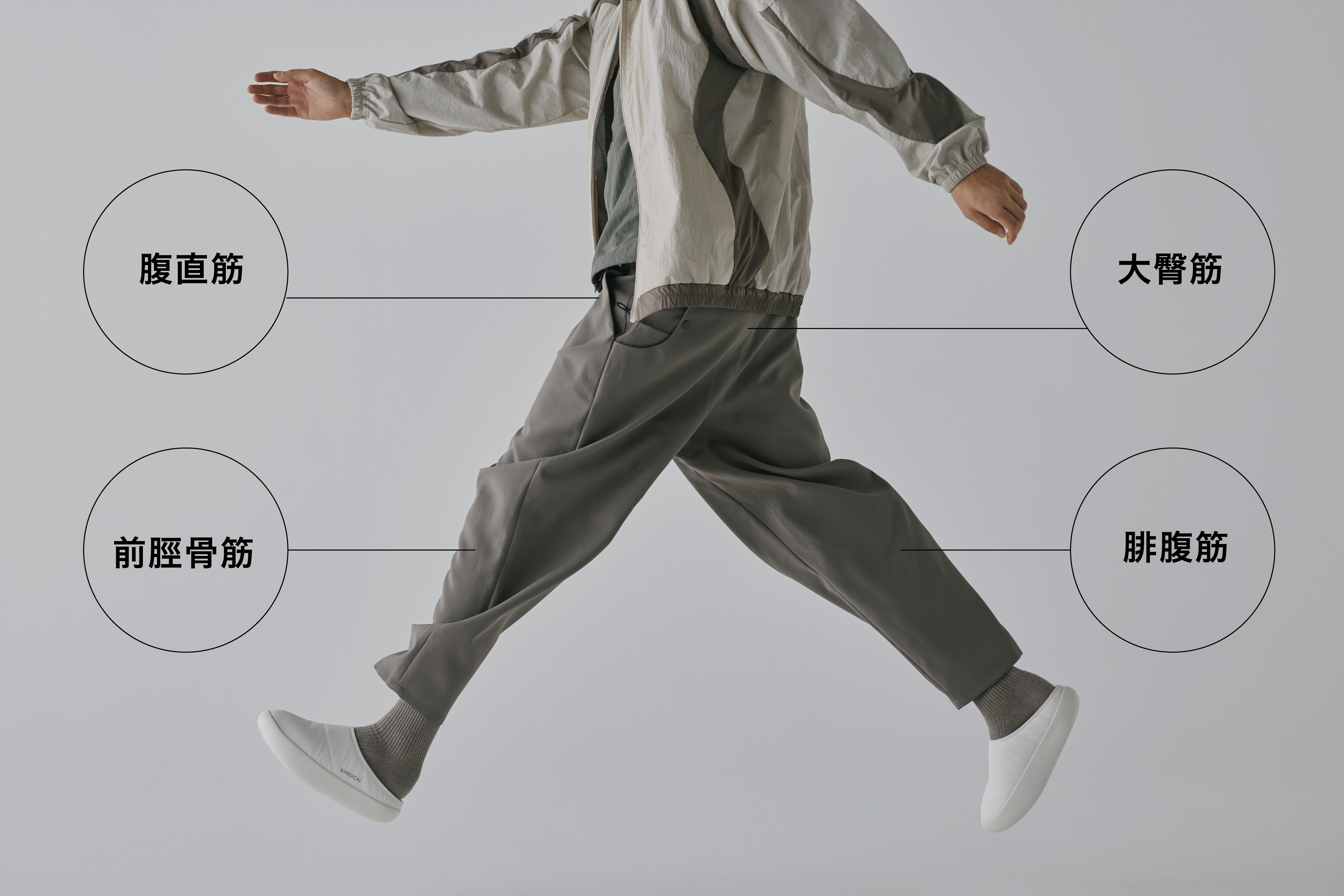 KAMOLEG3.0は多様な筋肉に働きかけるように設計されています。「ふくらはぎ(腓腹筋)」「お尻(大殿筋)」「お腹(腹直筋)」「太もも裏(ハムストリングス)」「ヒラメ筋」などの筋肉を歩くたびにエクササイズすることで、引き締まった下半身を目指します。